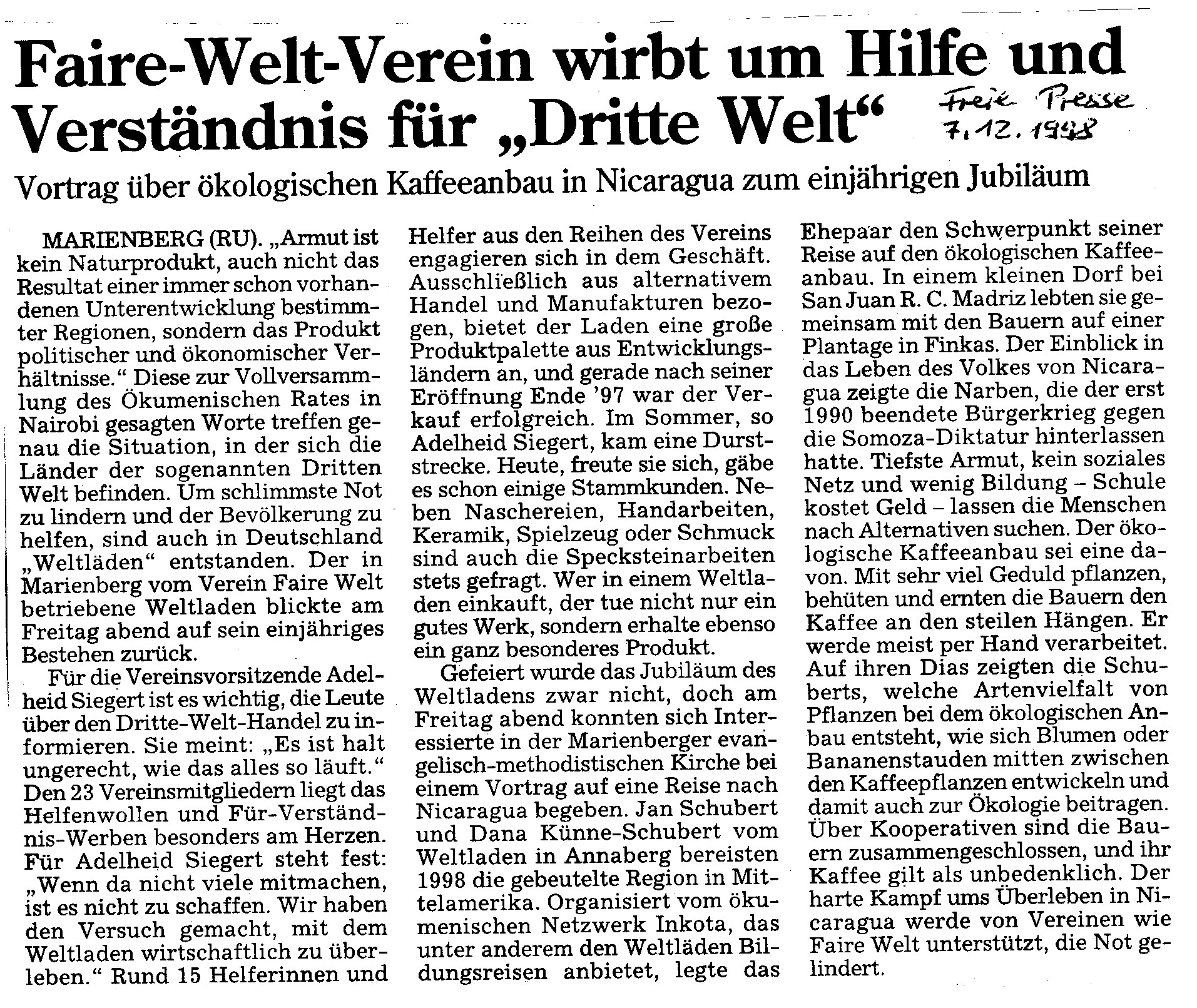 Am 06.12.1997 wurde der Weltladen Marienberg, Markt 4 eröffnet.