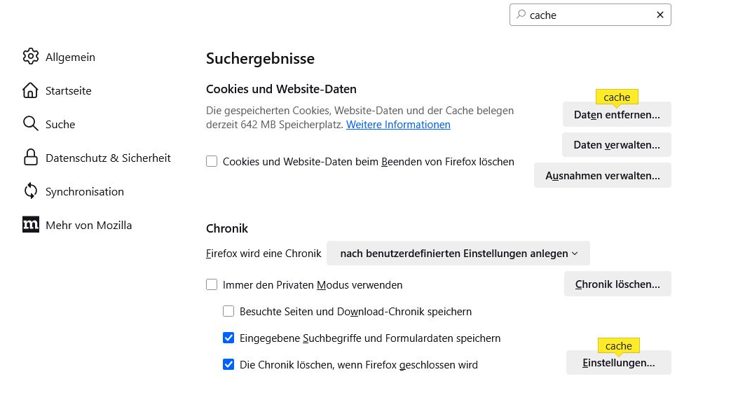 - Häkchen vor Temporäre Dateien und Seiten im Cache